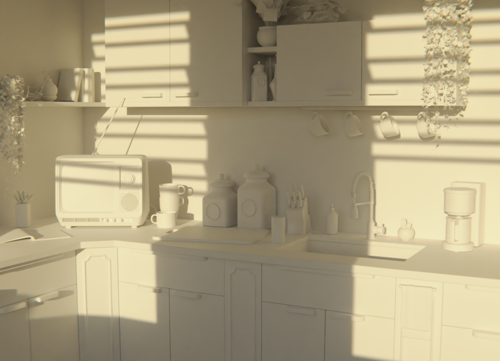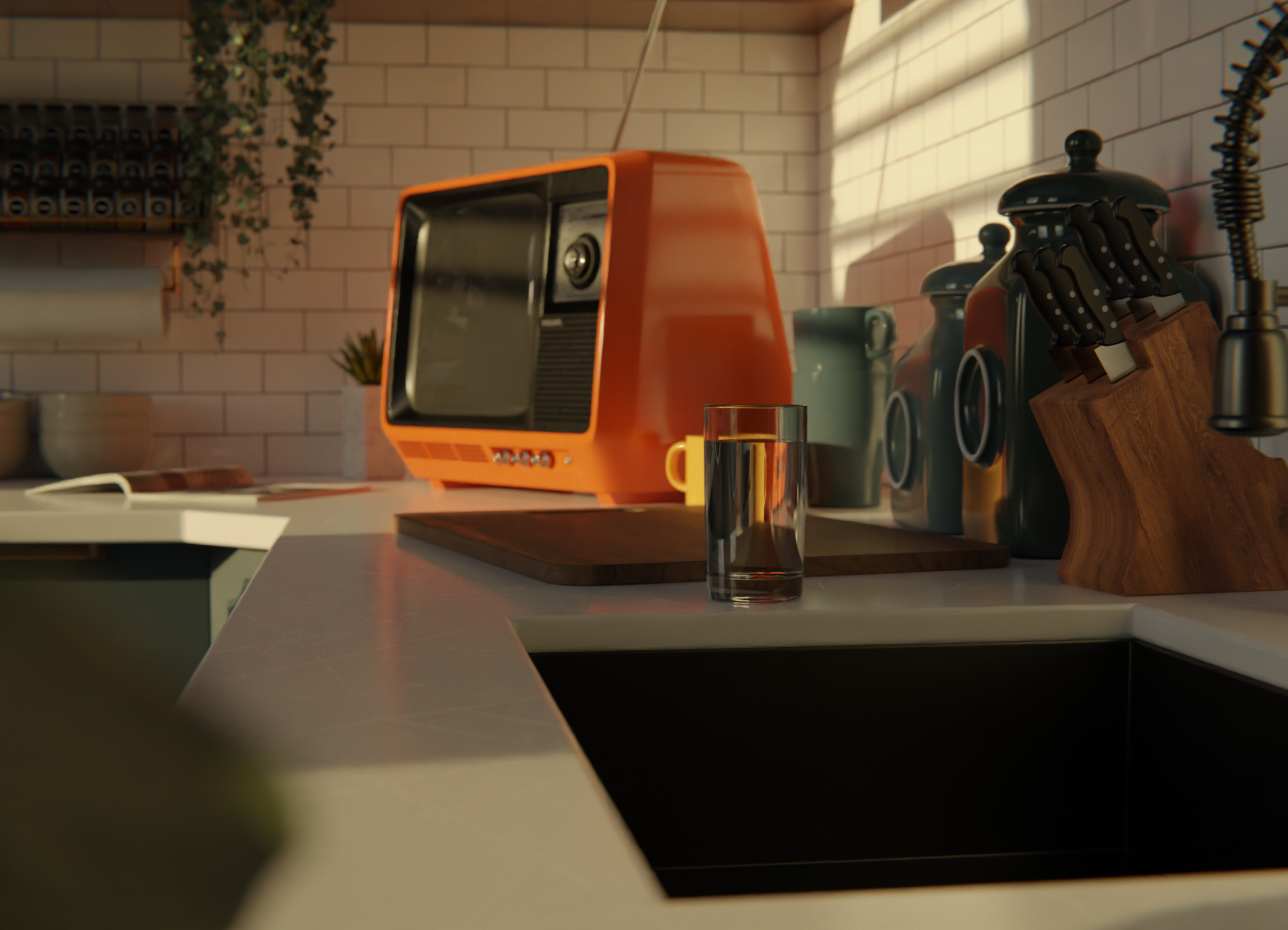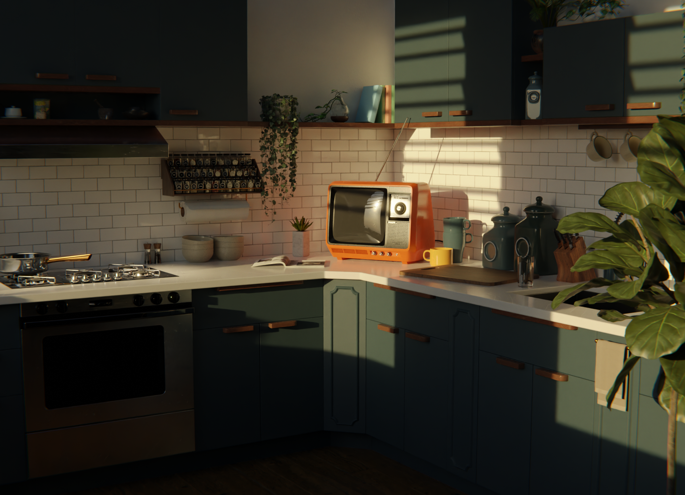 Interior rendering exercise based on a photo of a Philips TX television set, which is the focus piece of the room. The project vastly expanded the scale of the space, becoming a digital remodelling exercise.
